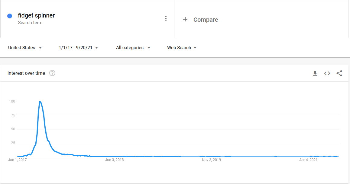 You might remember the fidget spinner craze of 2017: seemingly overnight, the world became obsessed with those little plastic spinners. The spinning toys flew off the shelves across the country and into kids hands. Classrooms, dinnertime at home, movie theaters – no place was safe from the fidget spinner. For what seemed like months, the world was a-buzz with fidget spinners.